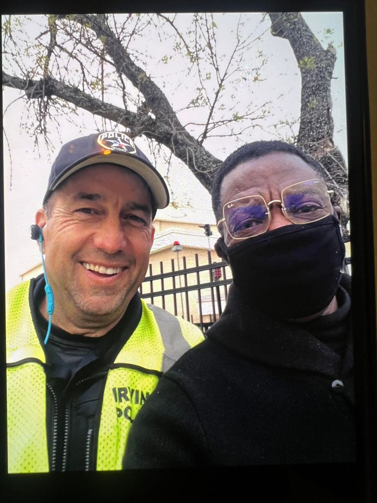 March 2025An Irvin Police Officer at Uplift High at the height of the Covid pandemic. Irvin TexasTwo High school kids locked their key in the car. I asked the immigrant gas station attendant to help them open the door and he did, after I brought a tennis ball they said could be used to open it failed. I asked how they knew it would, they referred me to YouTube. (Allen Texas, about 500 meters from my home.)Uplift High Irvin Texas.